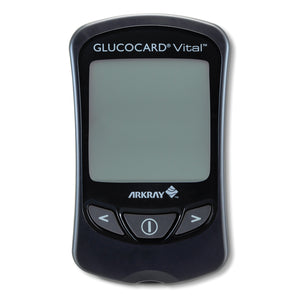 ARKRAY GLUCOCARD® VITAL™ BLOOD GLUCOSE MONITORING SYSTEM Blood Glucose Black Meter Kit Includes: 1 Meter, 10 Test Strips, 1 Bottle of Control Solution, Lancing Device, 10 Lancets, Log Book, User Manual & Quick Reference Guide