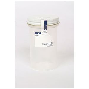 "Clear plastic construction with graduations offers easy observation and measurement of contents. Highly visible \"positive seal\" indicator clearly shows container is sealed when red bars are lined up. Exclusive metal lid with plastic lining provides a leak-resistant seal to minimize leakage of specimen during transportation."
