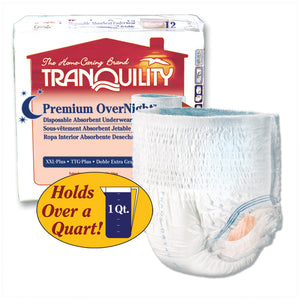 PRINCIPLE BUSINESS TRANQUILITY® PREMIUM OVERNIGHT™ DISPOSABLE ABSORBENT UNDERWEAR "Underwear, XXL-Plus Overnight DAU, 62\"-80\", 250+ lbs, Capacity 34.0 fl oz, 12/bg, 4 bg/cs "